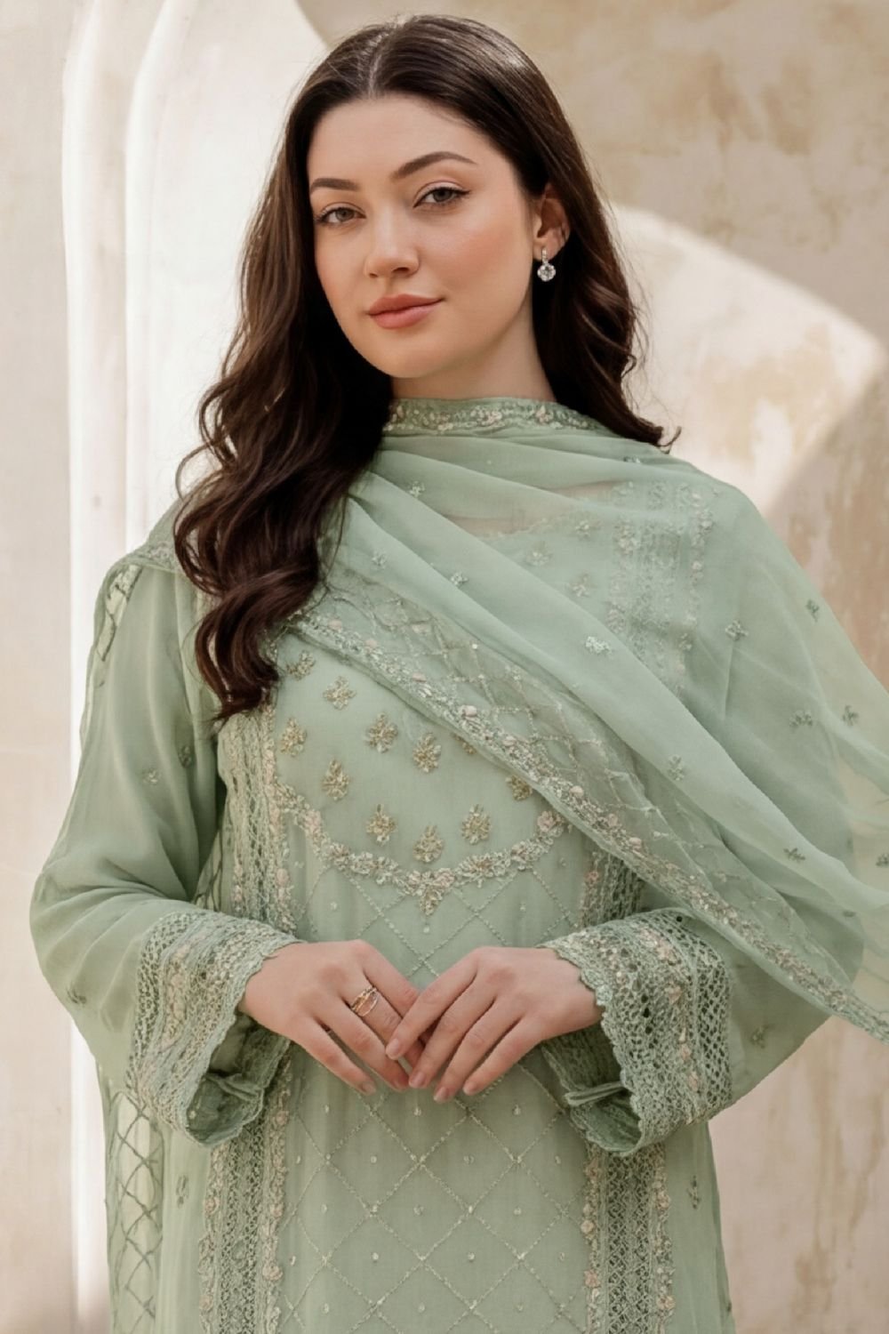 Luxury Dupatta: High-quality embroidered chiffon dupatta.