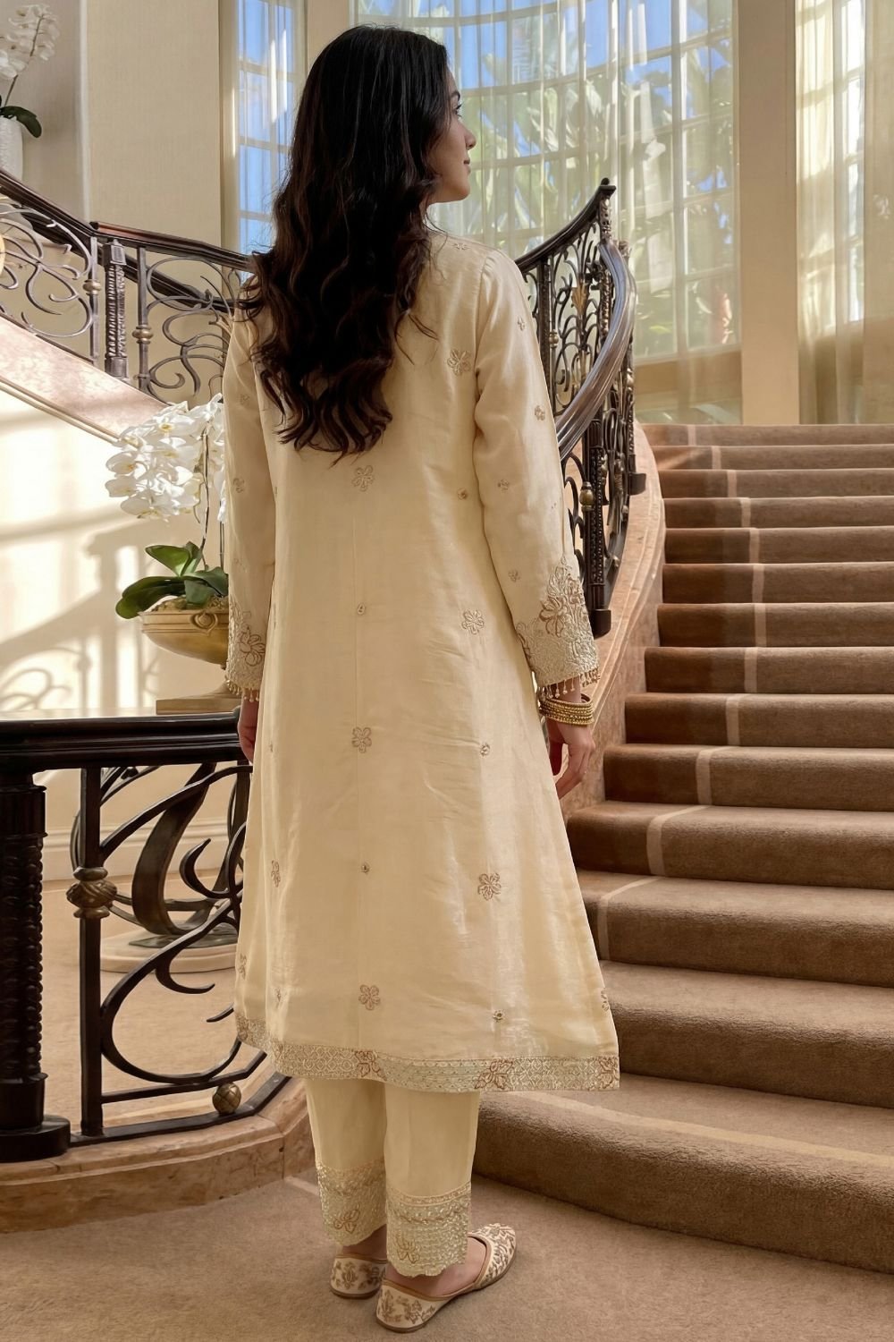 Tailored Trouser: Comes with Stitched Embroidered Sheesha Silk Trousers for a modern fit.
