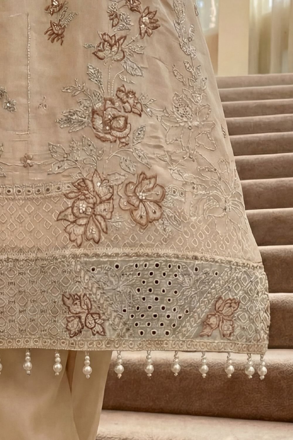 Premium Shirt: High-grade Sheesha Silk base with heavy embroidery and detailed hand embellishments.