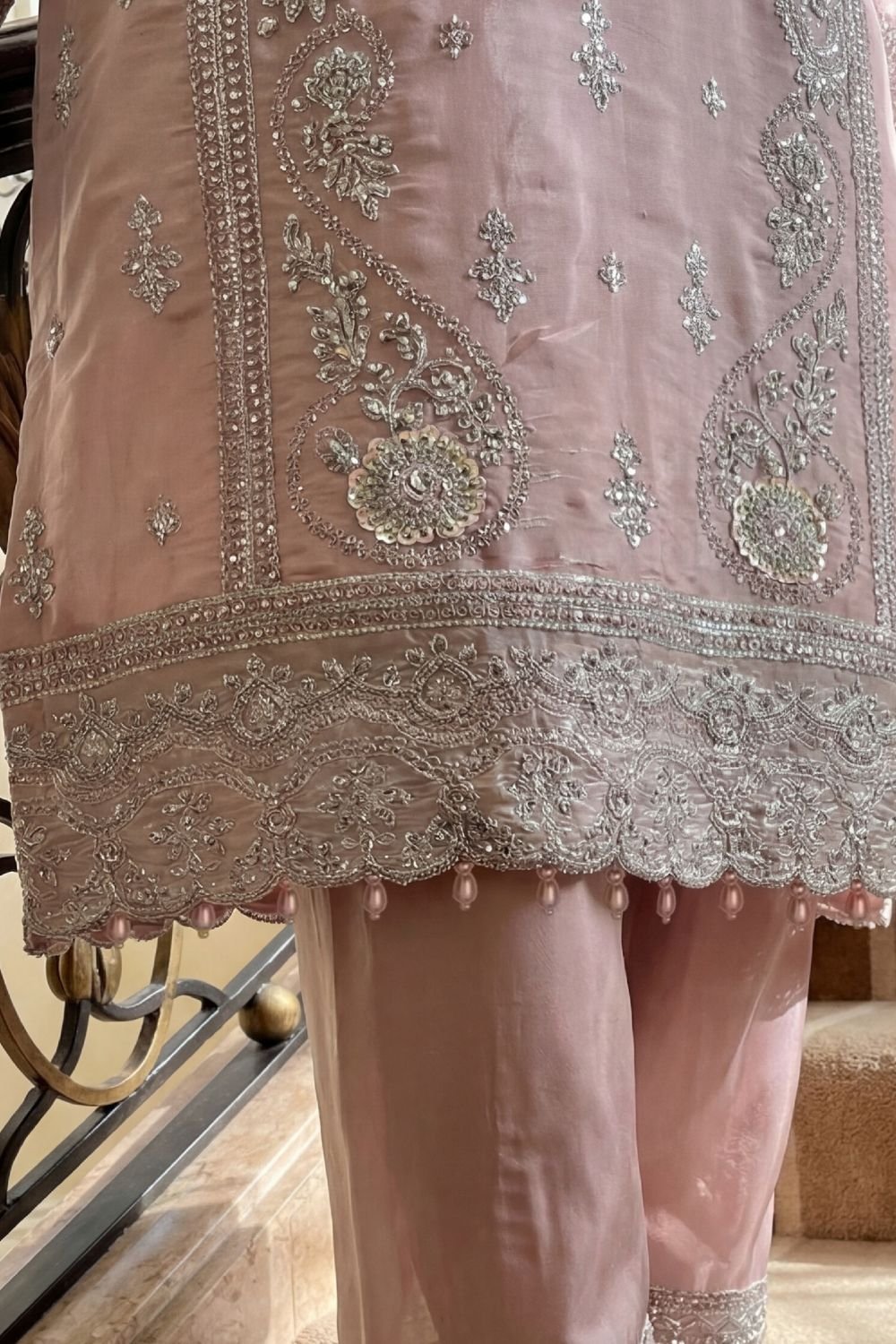 • Premium Shirt: High-grade Sheesha Silk base with heavy embroidery and detailed hand embellishments.