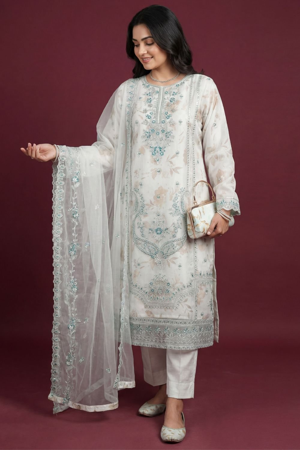 Experience the pinnacle of grace with the EVA Clutch & Khosa Collection. This Luxury Embroidered Organza Suit is meticulously crafted for weddings and formal gatherings, ensuring you stand out with a coordinated look.