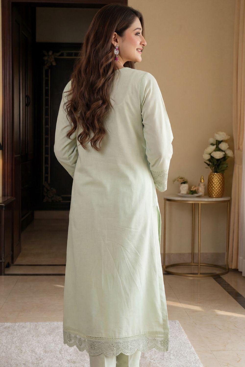 THIS STITCHED MASTERPIECE IS THE BEST COMBINATION OF MODERN ARTISTRY AND TRADITIONAL ELEGANCE. CRAFTED WITH PRECISION LASER-KARI EMBROIDERY AND DELICATE HAND-CRAFTED EMBELLISHMENTS, THIS ARTICLE IS A MUST-HAVE FOR YOUR SEASONAL WARDROBE.