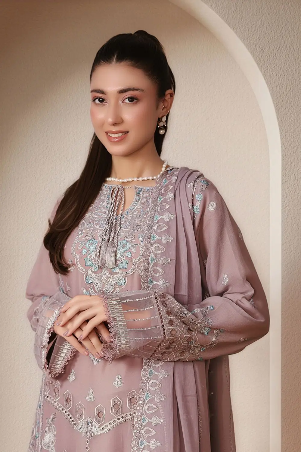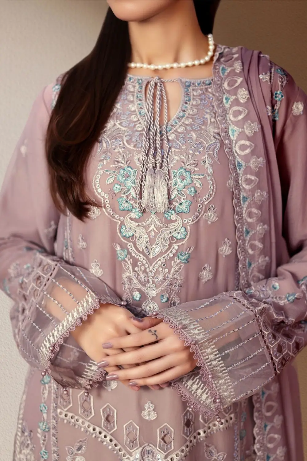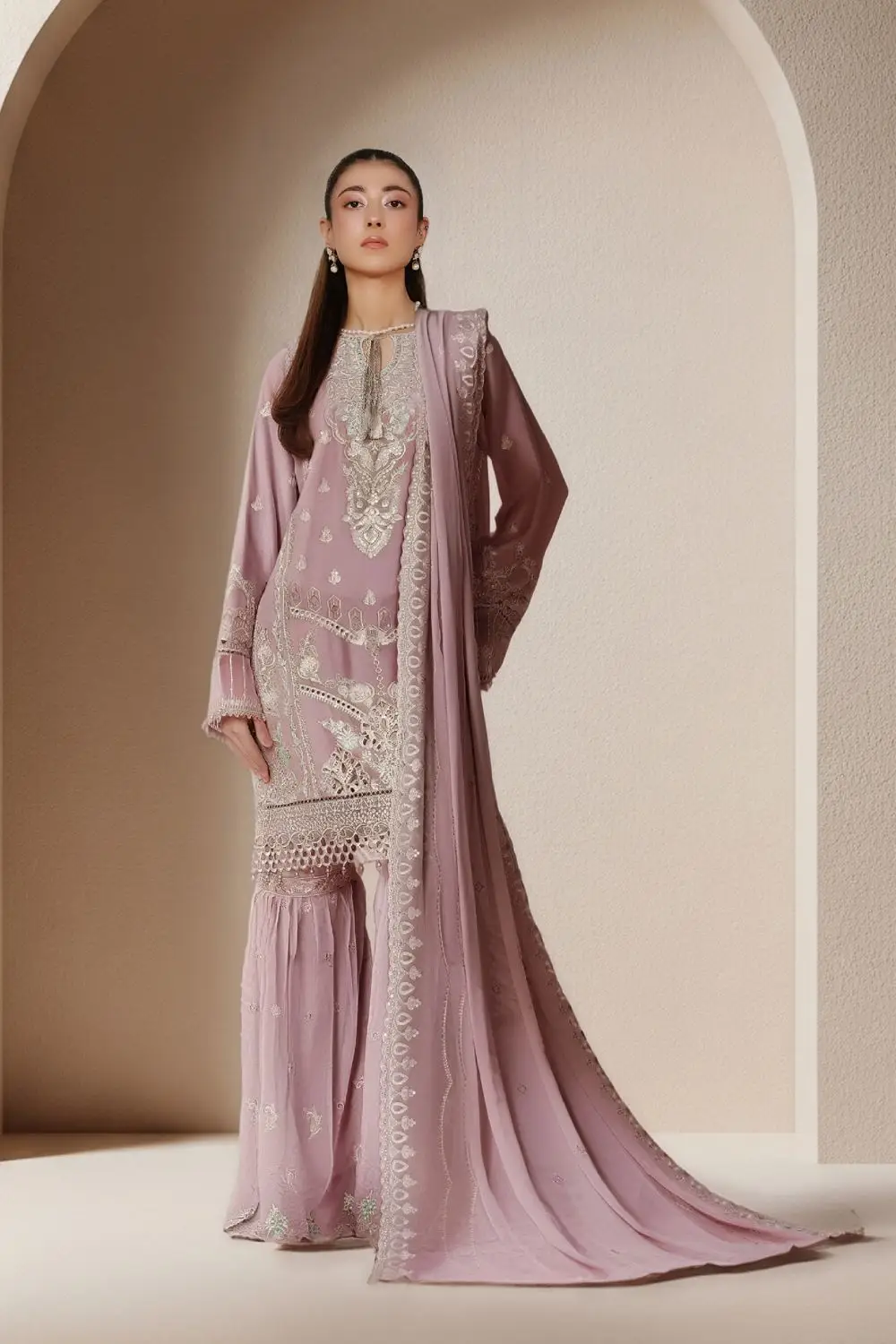 RANGOON LUXURY CHIFFON GHARARA Collection Elegance meets sophistication. This stitched 3-piece ensemble features exquisitely embroidered chiffon paired with a classic gharara, adorned with delicate sequins.