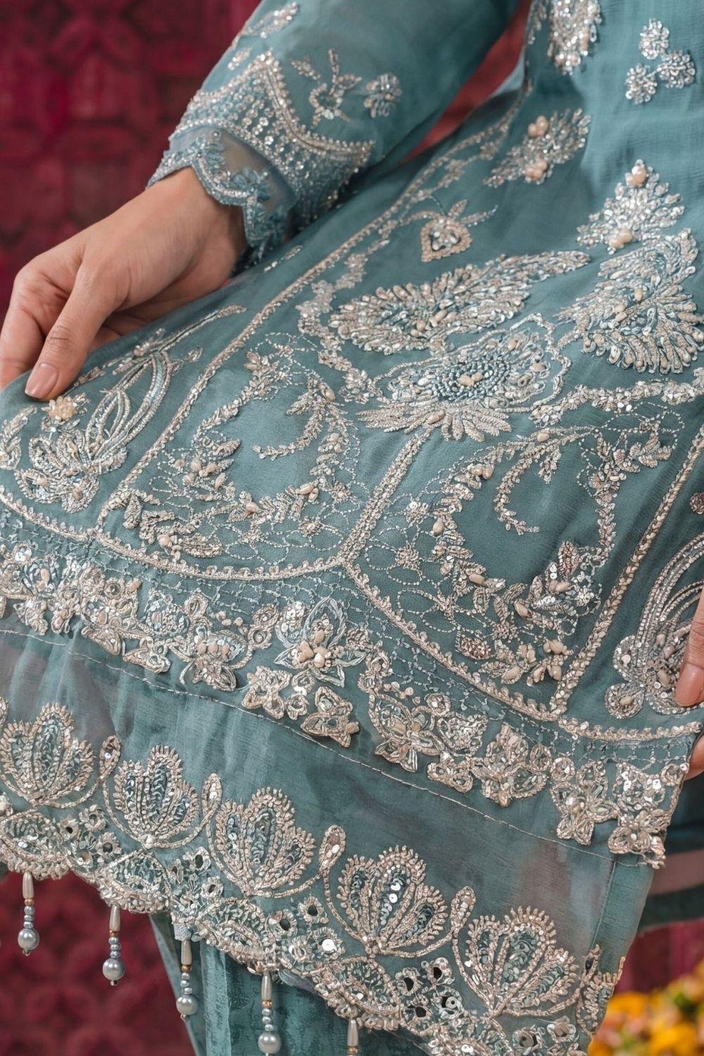 • SHIRT: SEMI-STITCHED LUXURY EMBROIDERED CHIFFON WITH HAND EMBELLISHMENT.
