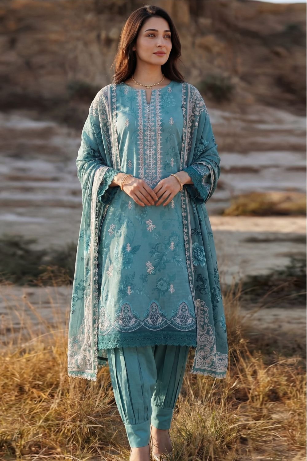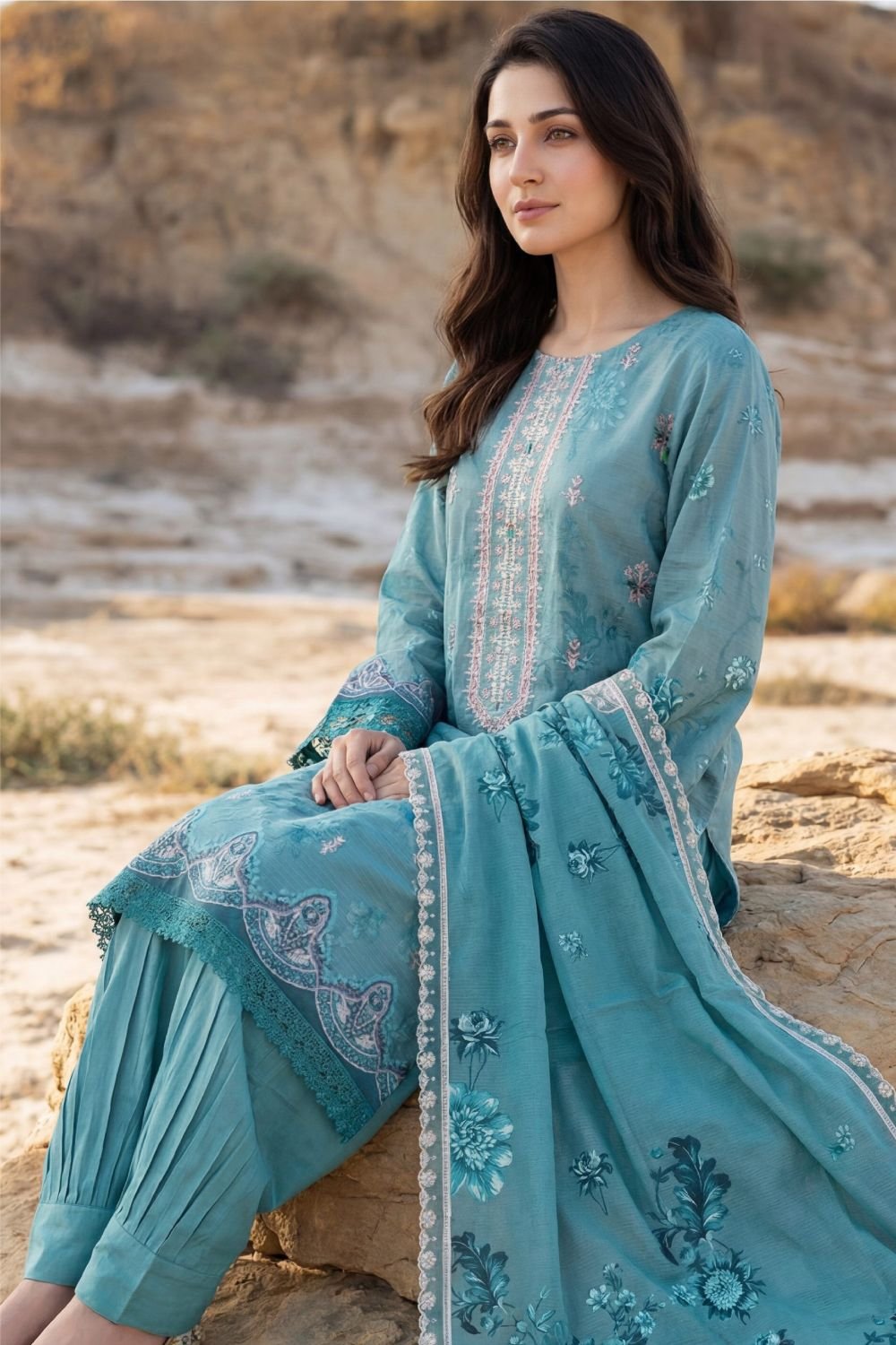 SASSI LUXURY EMBROIDERED brings you an exquisite blend of tradition and modern digital artistry. This premium 3-piece collection is crafted on high-quality Bana Dora Lawn, featuring heavy embroidery that adds a regal touch to your summer wardrobe.