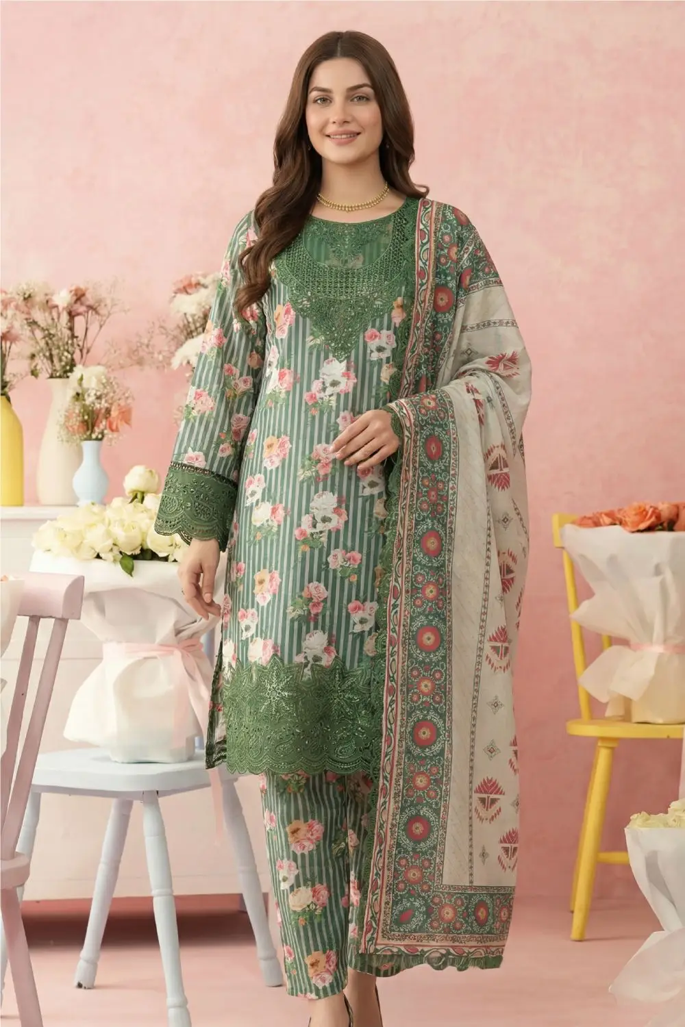 Experience the perfect blend of style with our EMBROIDERED LAWN PRINT 3-piece set by TANISH. This ensemble is designed to provide a graceful silhouette for any festive or formal occasion.